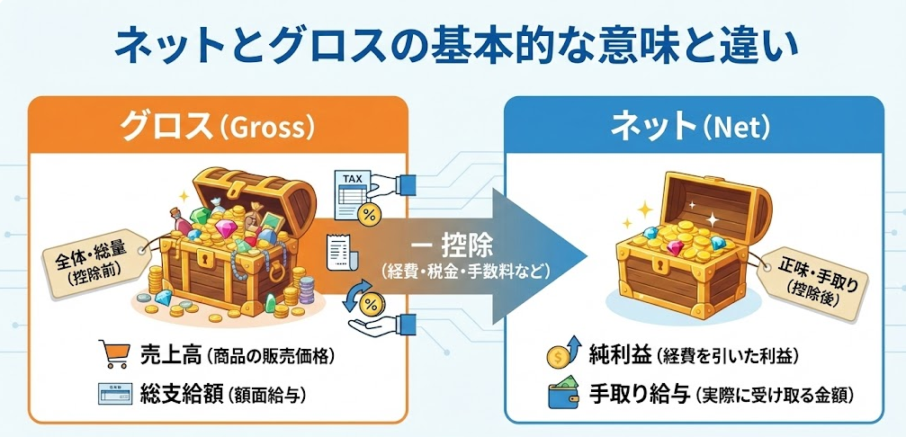 まず基本となるのは、「グロス」は控除などを行う前の総額を指し、「ネット」は税金や手数料などを差し引いた実質的な最終金額を意味するということです。