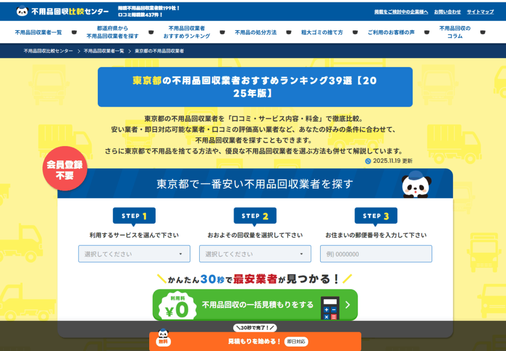 不用品回収比較センターは、不用品や粗大ごみの回収を行う優良業者を無料で検索・比較できるオンラインプラットフォームです。