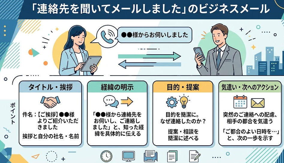 「連絡先を聞いてメールしました」は意味は通じますが、ビジネスメールでは少し直接的です。