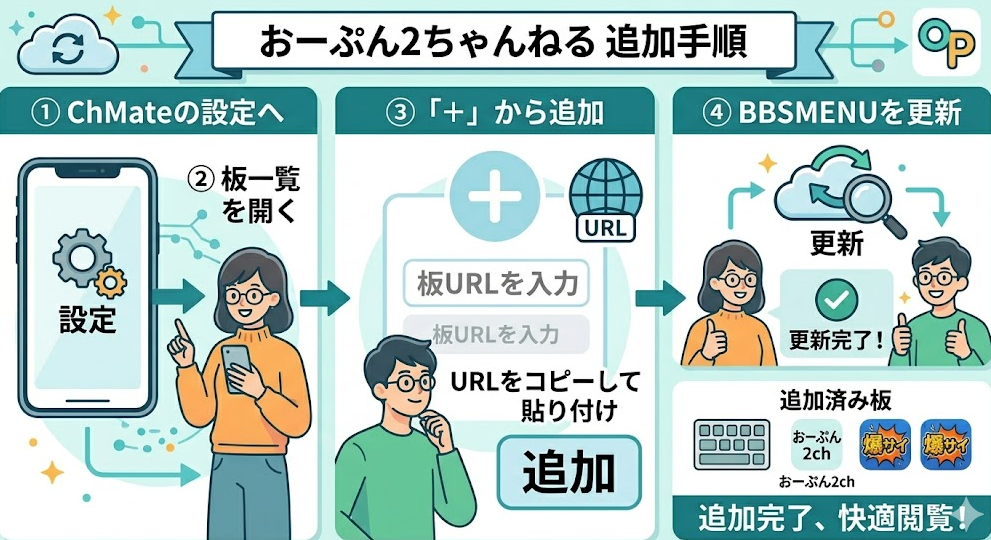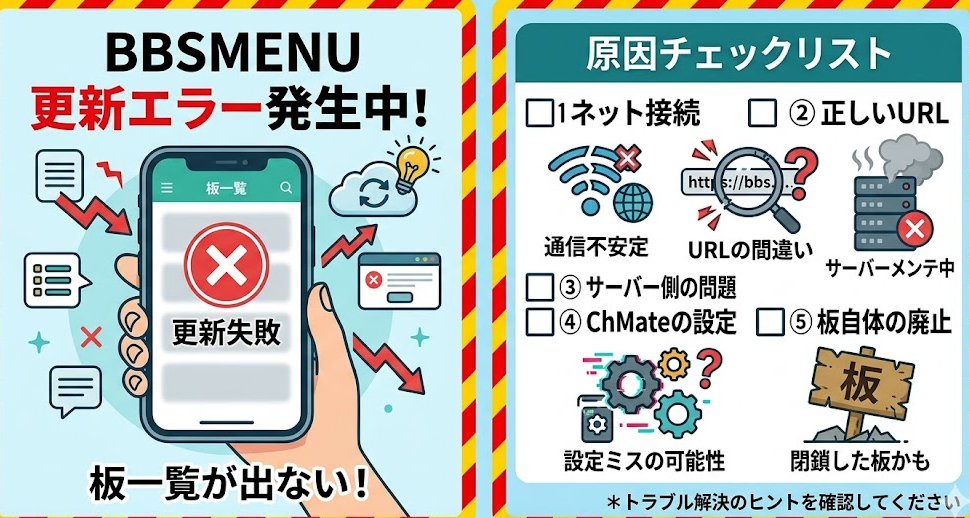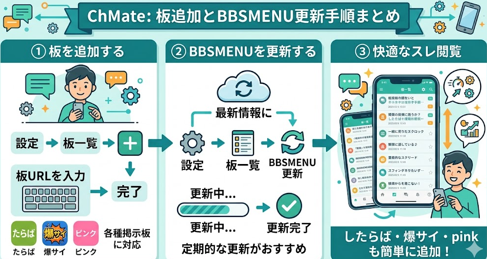 ChMate公式FAQでも、設定から「掲示板」を開き、BBSMENUのURLを指定して「板一覧を取得/更新」を押す流れが案内されています。板が見られなくなったときも、公式はまず板一覧更新を試すよう案内しています。