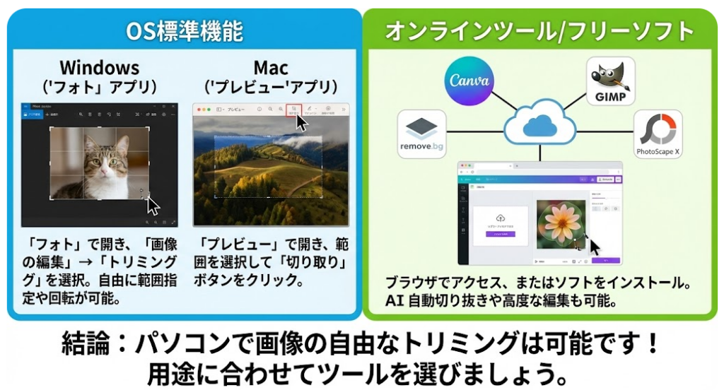 標準ソフトからオンラインツール、PowerPointやPhotoshopの応用まで、Windows・Mac両対応のおすすめツールを実例つきで紹介。サイト不要でできる方法や、一部だけを切り抜きたいときの便利技もあわせてご紹介します。