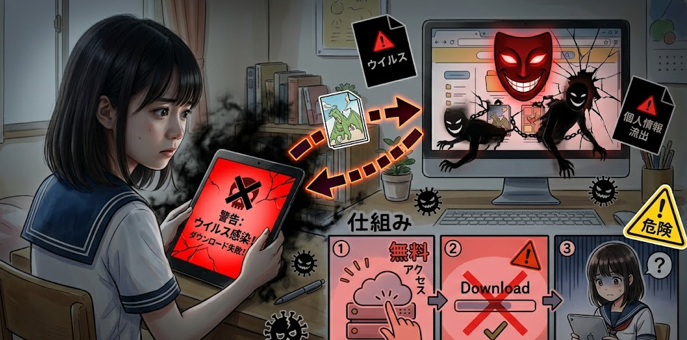Free PDF Comicのような名称で探される漫画PDF系サイトは、読みたい作品に早く届くように見えて、実際には広告遷移、偽警告、フィッシング、無許諾配信のリスクを抱えやすい入口です。文化庁は海賊版と知りながらのダウンロード違法化を案内しており、ABJも正規サービスに似せた海賊版の危険を警告しています。