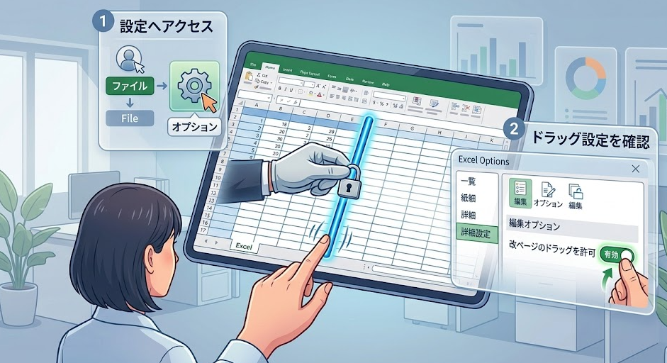 少なくとも、ドラッグ&ドロップ設定や改ページプレビューの条件は満たせているかを再確認すべきです。Microsoft公式でも、ページ区切りの移動にはその前提条件があると案内しています。