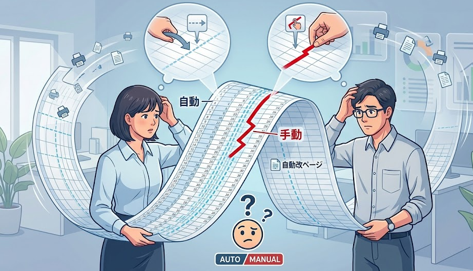 このとき厄介なのは、改ページの不具合に見えても、実際は「表示モード」「拡大縮小」「ドラッグ設定」「印刷範囲」のどれかが原因であるケースが多いことです。