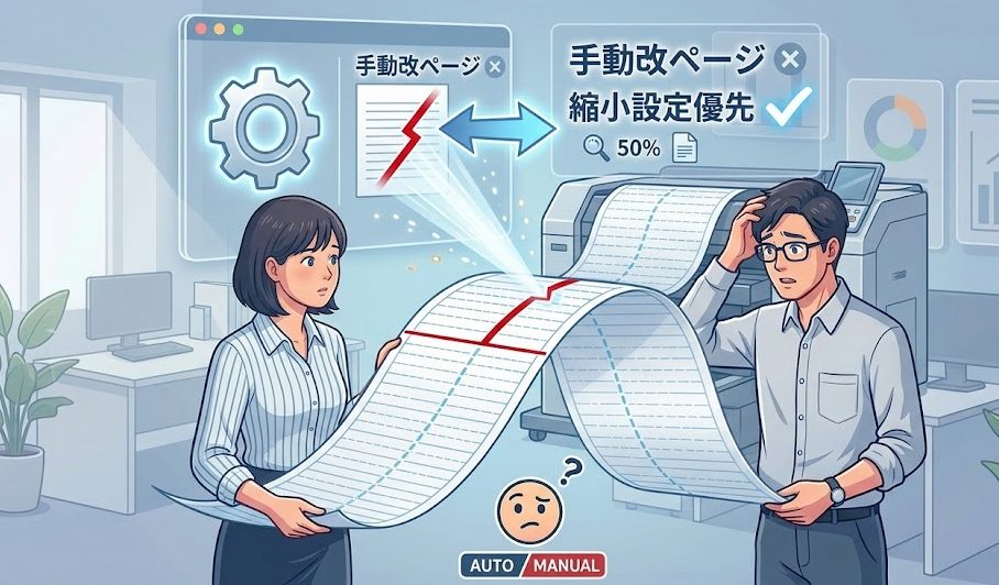 改ページの不具合ではなく、印刷縮小が強すぎるだけということが本当に多いです。
