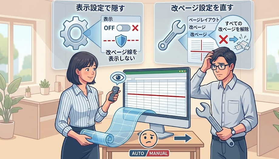 Microsoft公式では、改ページプレビューで破線はExcelが自動で入れたページ区切り、実線は自分で追加した手動改ページだと説明しています。