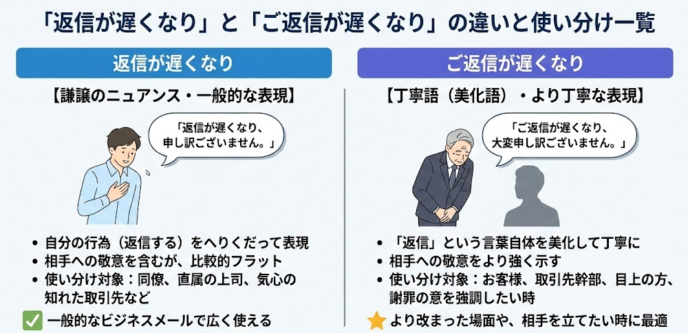 次に、「返信が遅くなり」と「ご返信が遅くなり」はどう違うのか、という点を整理しましょう。