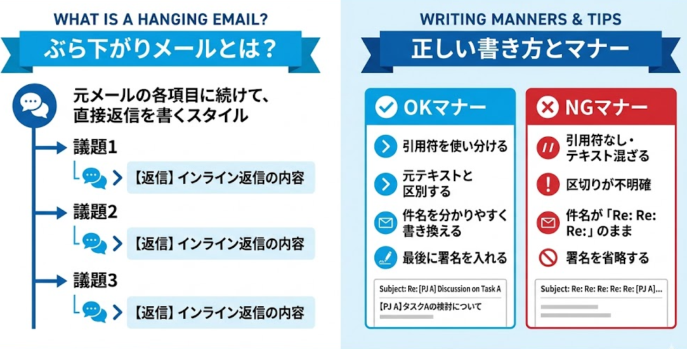 逆に、単純なお礼や承認でインライン返信を使うと、細かすぎて読み手のテンポを崩します。だからこそ、ぶら下がりメールという土台の上で、どこまで細かく返すかを判断する必要があるわけです。