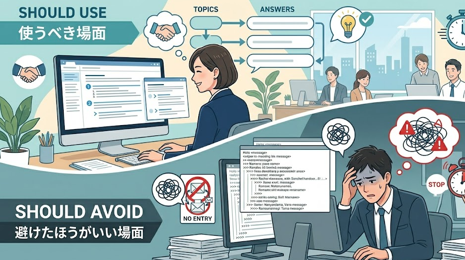 たとえば、日程調整、見積確認、修正依頼、納期確認のように、前提のズレが起きやすい話ではかなり有効です。