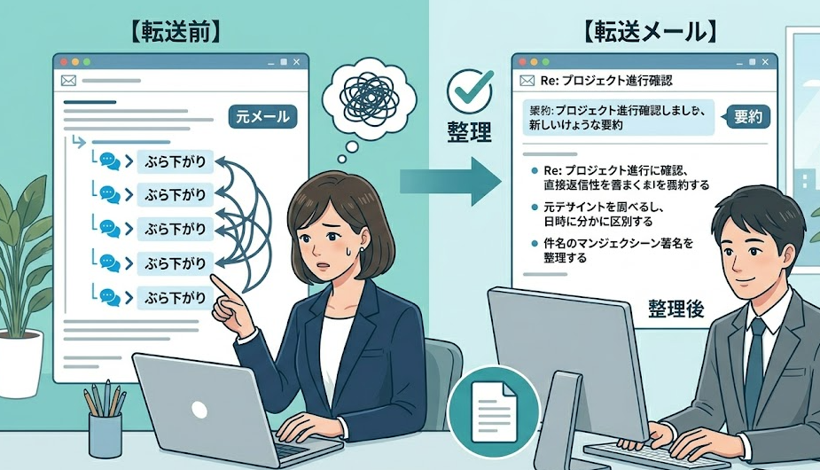 そんなときは、転送ではなく新規メールで「要点だけまとめて送る」ほうが実務的です。