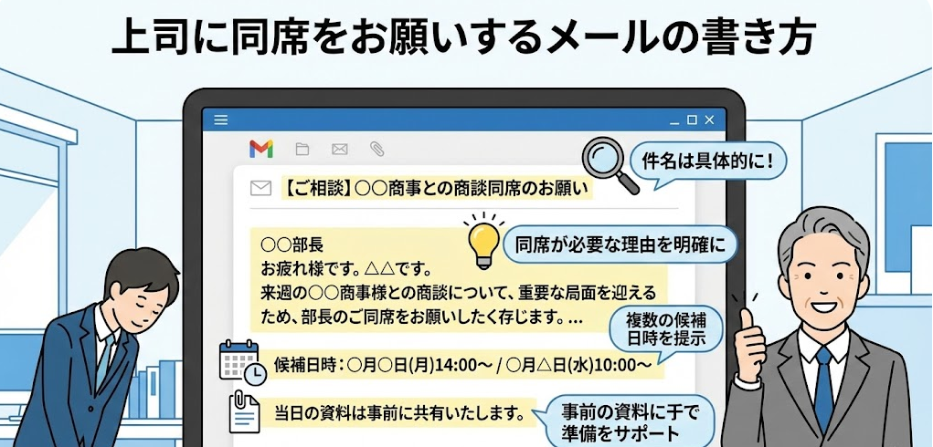 社内で上司に同席をお願いする際の依頼メールは、相手のスケジュールを尊重しつつ、趣旨を明確にすることが重要です。