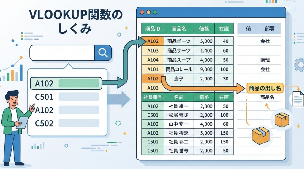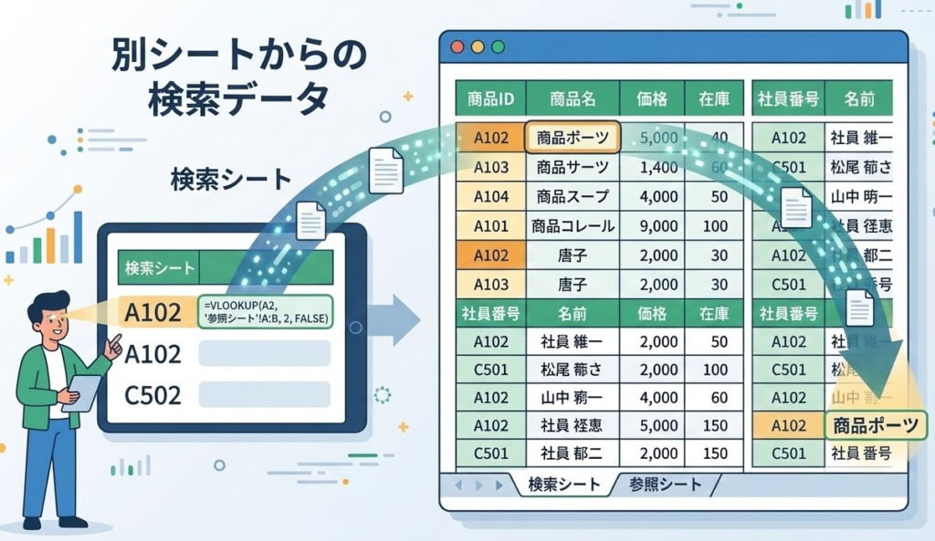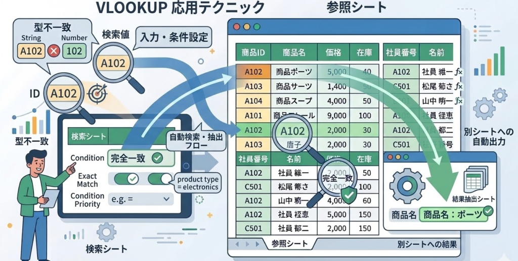 VLOOKUPは単純な検索だけでなく、「条件に合う値を別シートから自動で取得する」といった使い方も可能です。たとえば、部門ごとに売上データを集約する際、部門名をキーにして実績値を引っ張る設定を作ることができます。