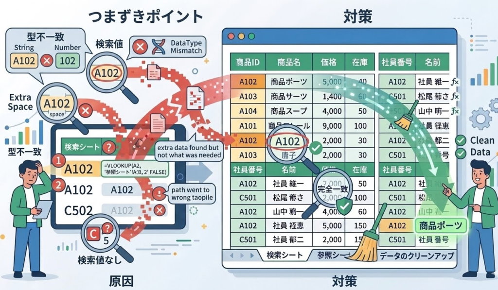 検索値が数値として入力されているのに、範囲側が文字列になっていると一致しません。逆も同様です。この場合、TEXT関数やVALUE関数で型をそろえることで解決します。