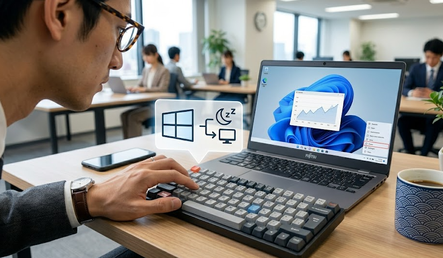 資料の提出直前に席を外すことになって、マウスを握ったまま「一番速くスリープにする方法どれだっけ」と手が止まったことはありませんか。スタートメニューを開いて電源を押して……とやっているうちに、社内チャットの通知が見えたままになったり、外出先の打ち合わせで画面を覗かれそうになったりすると、地味に焦りますよね。