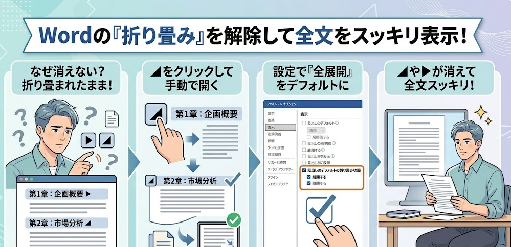 Wordの折り畳み機能を一括解除して全文表示する方法