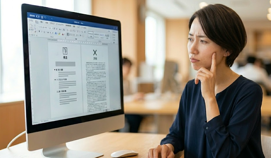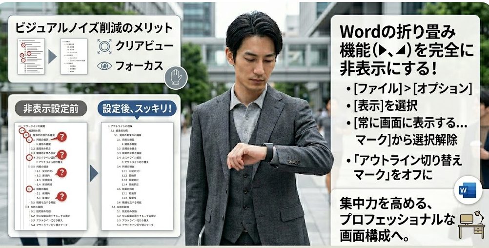 Wordを開いた瞬間、見出しの横に「▶」や「◢」が表示されていて、クリックすると本文が消える。そんな状態で「え、内容どこいった?」と一瞬止まったことはありませんか。