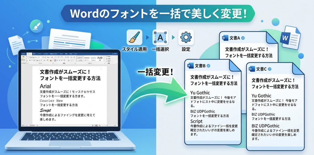 Wordのフォントは一括変更を使うと、数秒で整えられます。