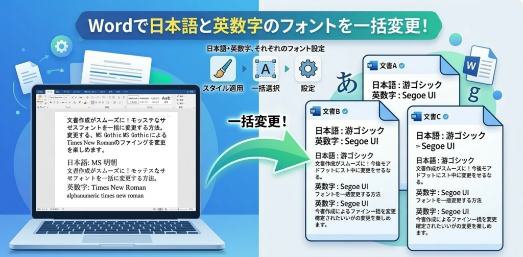 文書全体をまとめて変更したり、日本語と英数字を同時に整えたりすることも可能です。