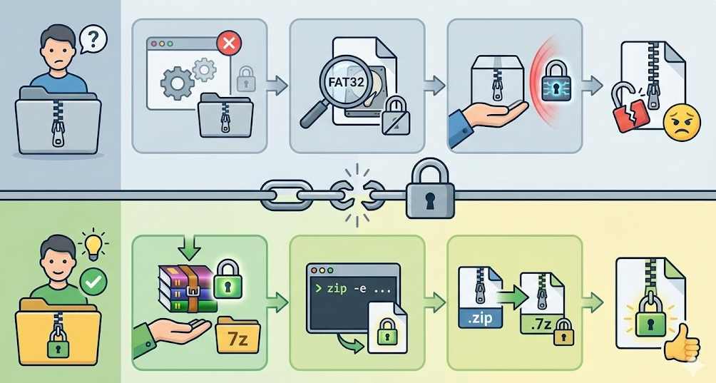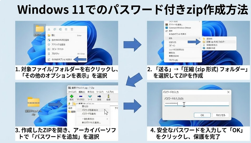 zipファイルは便利ですが、セキュリティを軽視すると重大な情報漏洩につながります。OSによって方法が異なるため、自分の環境に合わせて正しい手順を選びましょう。