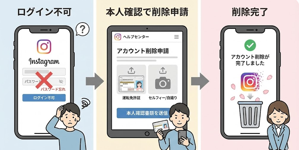 結論として、ログインできないInstagramアカウントを削除する現実的な方法は、Instagram側に「本人である証拠」を出して削除対応を依頼するルートです。パスワード再設定ができない、登録メールや電話番号が使えない場合でも、本人確認が通れば前に進められます。