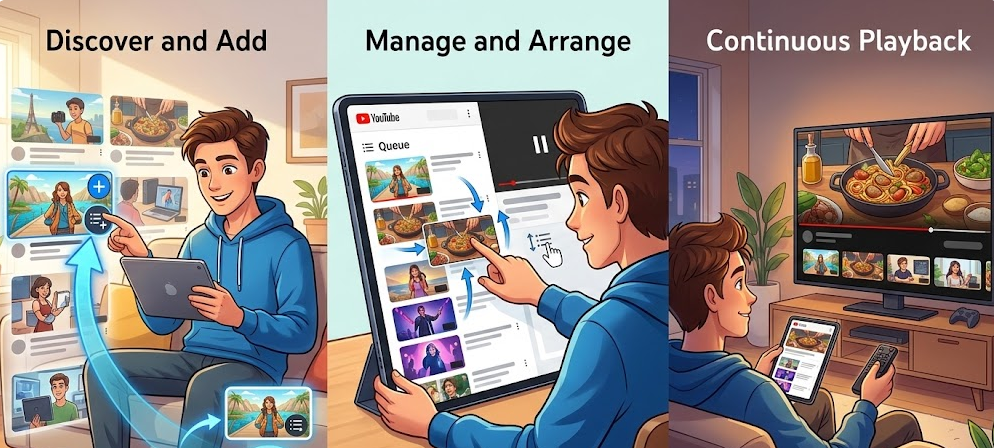 YouTubeの「キュー」は「今この場だけの再生順リスト」で、タブ地獄や視聴の迷子を減らしてくれる便利機能です。追加はメニューから「次に再生」「キューに追加」を選ぶだけで、解除は個別削除か全体クリアの2択で考えると迷いません。